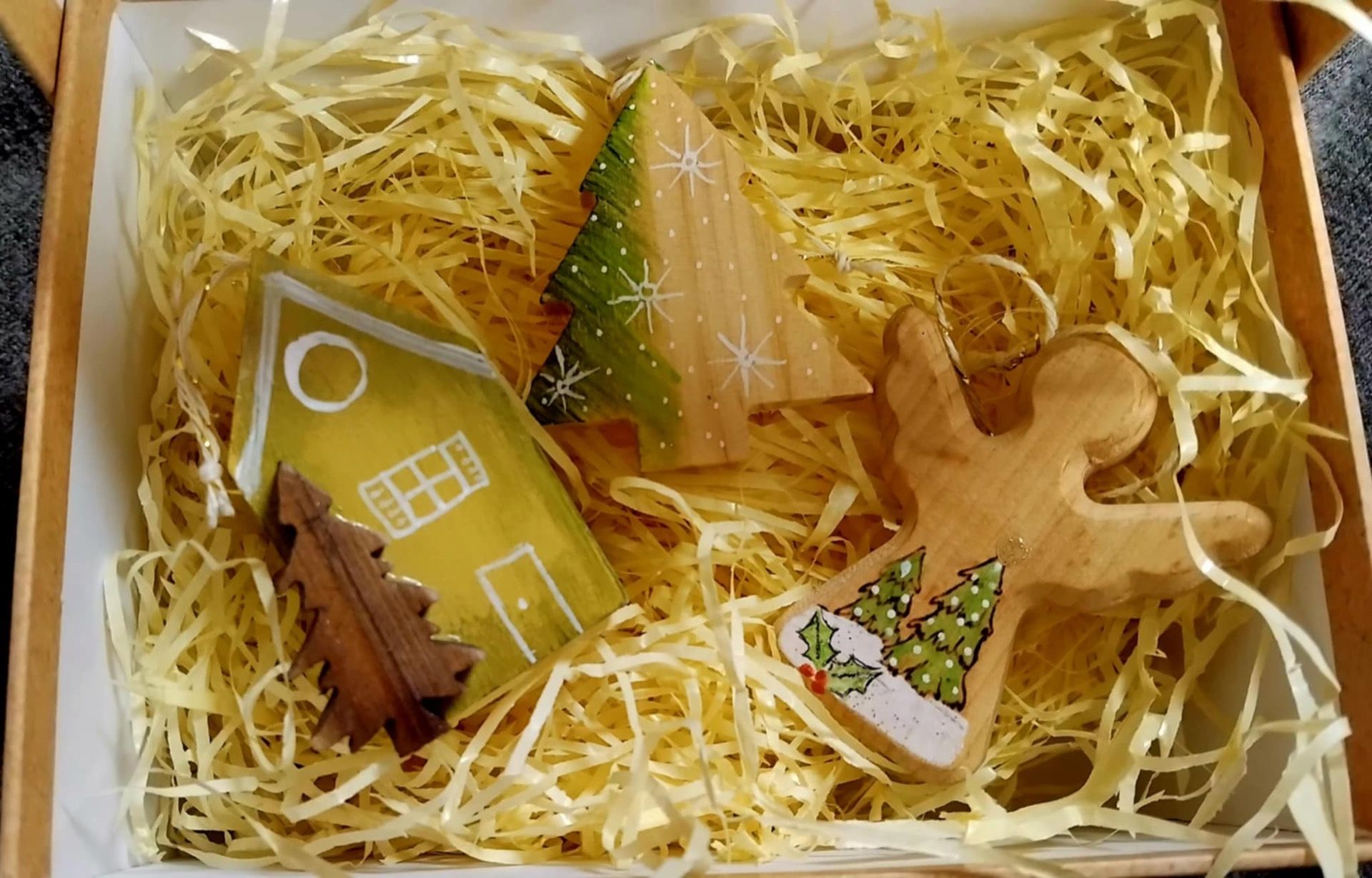 Présentée dans une jolie boite en carton, cette selection d'ornements en bois pour votre sapin est délicatement nichée dans un lit de paille. Elle se compose de trois sujets artisanaux entierement décorés à la main, tous travaillés dans les tons de vert qui évoquent l'esprit chaleureux des fêtes. Peints et vernis pour un plus joli rendu les objets de la sélection représentent une petite maison en bois décorée d'un sapin miniature apportant un charme rustique et poétique, un petit ange aux lignes douces et épurées symbole de protection et un sapin finement détaillé parfait pour compléter une décoration naturelle. et harmonieuse.