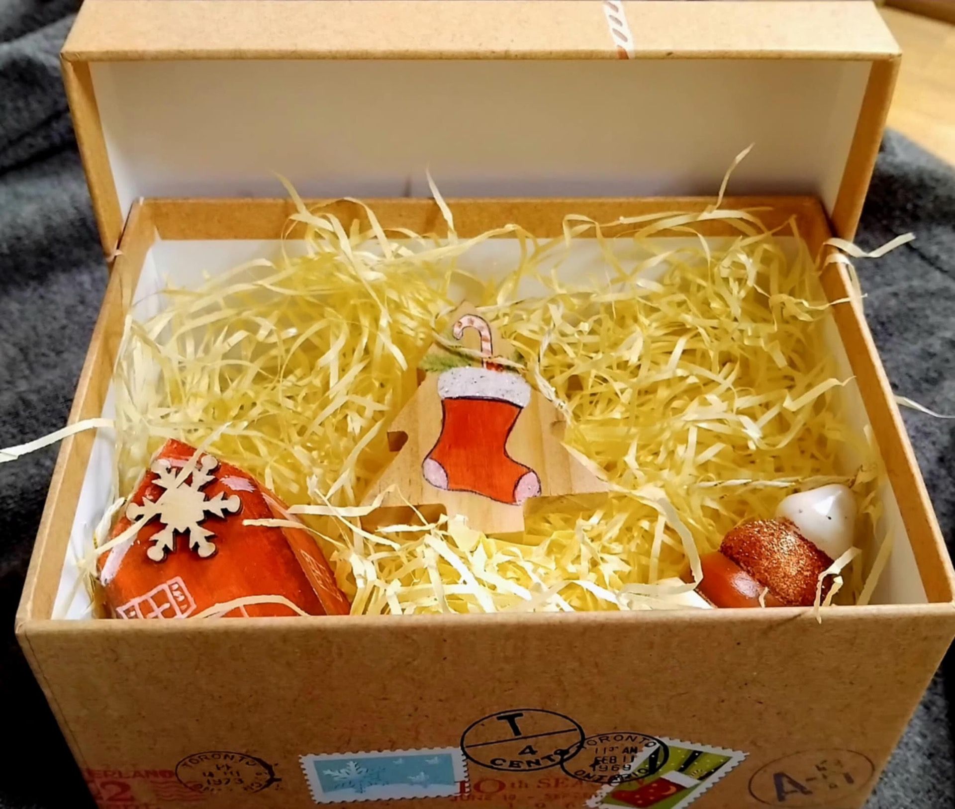 Présentée dans une jolie boite en carton, cette selection d'ornements en bois pour votre sapin est délicatement nichée dans un lit de paille. Elle se compose de trois sujets artisanaux entierement décorés à la main, tous travaillés dans les tons de rouge qui évoquent l'esprit chaleureux des fêtes. Peints et vernis pour un plus joli rendu les objets de la sélection représentent une petite maison en bois décorée d'un flocon miniature apportant un charme rustique et poétique, un petit sapin aux lignes douces et épurées décoré d'une botte de Noël et un sapin finement tourné parfait pour compléter une décoration naturelle. et harmonieuse.